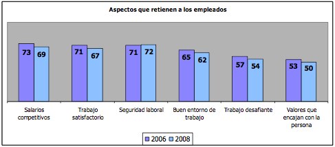 Aspectos que retienen a los empleados ‘El mundo del trabajo’ indaga en las distintas variables que pueden retener a un empleado en su puesto y analiza cómo esas variables han cambiado en los últimos años debido a la desaceleración económica. Según el informe, lo más importante para los empleados es tener un sueldo competitivo (así lo afirma un 72% de los encuestados), mientras que otras variables pierden importancia.