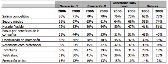 Los trabajadores de la ‘Generación Y’ (nacidos entre la década de los 80 y el año 2000) están creciendo, convirtiéndose en más pragmáticos y sus expectativas están evolucionando. Los trabajadores de la ‘Generación X’ (nacidos entre 1961 y 1980) invierten más en mantener su situación profesional que en cambiarla. Por su parte, los “babyboomers” (los nacidos entre 1945 y 1960) se sienten los portadores de la cultura corporativa, legal e histórica. Ellos demandan el reconocimiento de su contribución al trabajo, pero sienten la presión de la desaceleración económica, que puede destruir sus planes de jubilación.