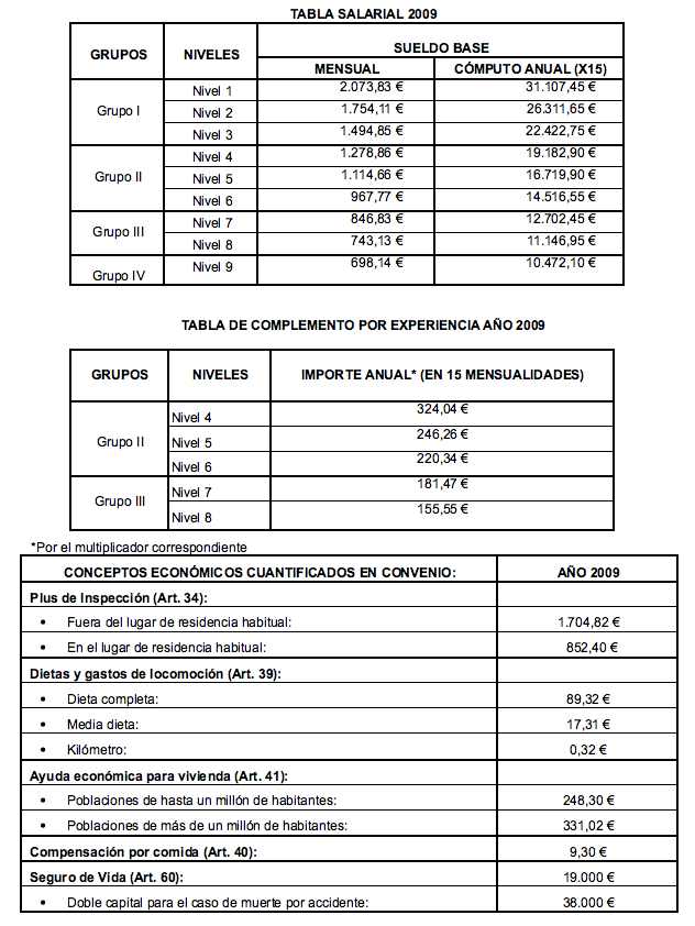 Por otra parte en aplicación del artículo 36 del Convenio sobre condiciones económicas para el año 2009 la Comisión Mixta elaboró las tablas salariales para el año 2009 aplicando sobre la tabla del 2008 la previsión de IPC situada en el 2%. Dichas tablas son de aplicación desde el 01 de enero de 2009.