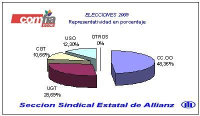 En las elecciones en ALLIANZ participan 5 sindicatos por lo que conseguir esta cuota de representación tiene mucha dificultad. En una clara apuesta de la plantilla por los sindicatos de clase, CC.OO y UGT ganan representación frente a procesos anteriores, (UGT obtiene un 28,69%), en detrimento de los sindicatos USO, (12,30%, pierde 5 delegados), y CIG (pierde toda representación).