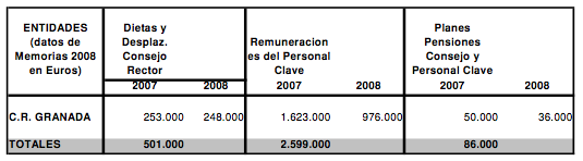 En los dos últimos años, el Consejo Rector y el equipo de dirección de Granada han cobrado como si trabajaran en un banco suizo, y han sido un tanto avaros con los trabajadores. Los datos que hemos extraído de la Memoria de 2008, publicada y auditada por una compañía externa, nos indican que: