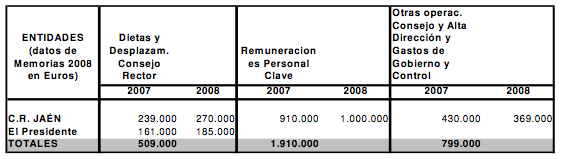 En 2008, el Consejo Rector ha cobrado por dietas, gastos de asistencia y desplazamiento 270.000 euros, más otros 369.000. euros en Gastos de Gobierno y Control. Solo el Sr. Presidente, cobró 185.000 euros. Ya en el año 2007 los gastos del Consejo ascendieron a 239.000 euros de dietas y gastos de desplazamiento y 430.000 euros de Gastos de Gobierno y Control. El señor Presidente cobró 161.000 euros.