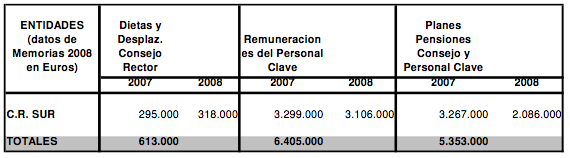 - En 2007, la Caja Rural del Sur aportó al plan de pensiones 3.267.000 euros para el director general y el comité de dirección/Consejo (desconocemos a cuantas personas hace referencia, pues la memoria no lo indica). En 2008, la misma partida ha sido de 2.086.000 Euros.