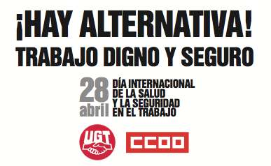Sin embargo, en CCOO y UGT estamos convencidos que esta situación no es irre- versible. Hoy más que nunca la movilización es necesaria para demostrar que hay alternativas, que otra política económica y social es necesaria y posible y que la existencia de trabajos dignos y seguros es una de las bases en las que fundamentar un cambio de paradigma económico que nos permita salir de la crisis desde una perspectiva más justa, equilibrada y sostenible. Por este motivo invitamos a los tra- bajadores y trabajadoras, y al conjunto de la ciudadanía a movilizarse este 28 de abril en defensa de la salud y la seguridad en el entorno laboral y en recuerdo de las víctimas de las malas condiciones de trabajo.