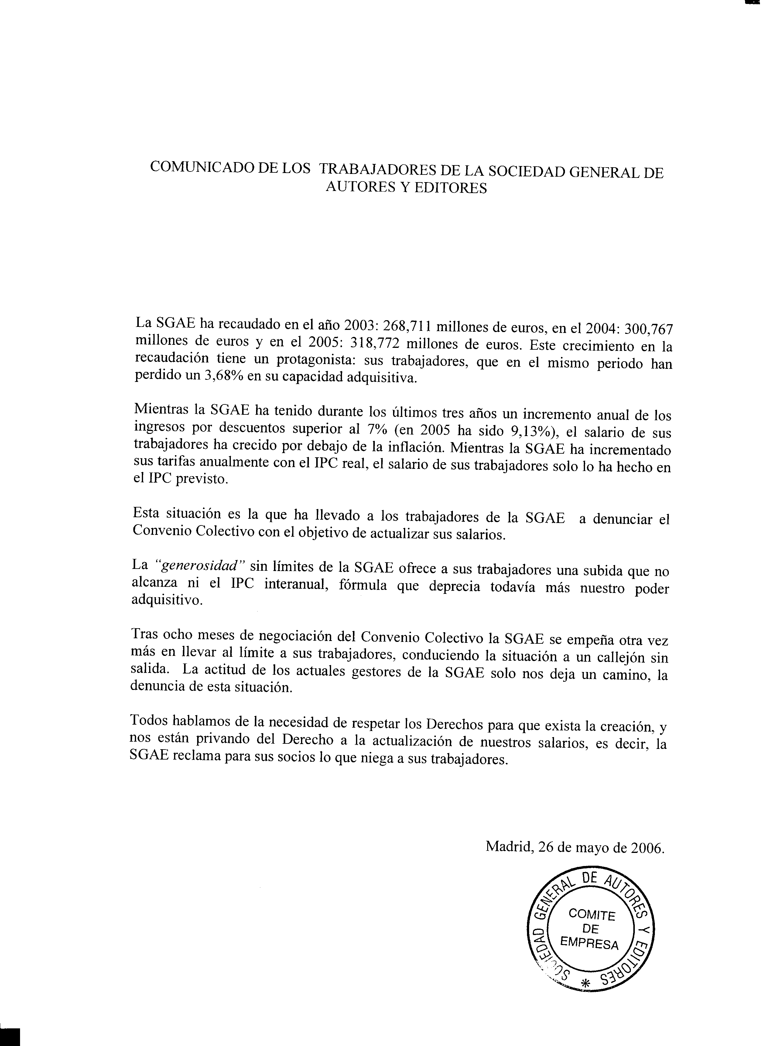 Comunicado del Comité de Empresa de la SGAE